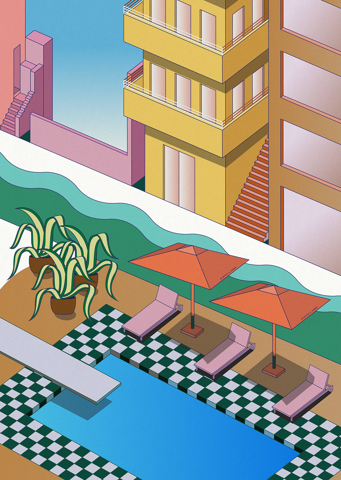 past handpainted papers, a heavy gradient-based poolside illustration,